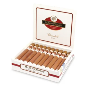Flor De Copan Churchill: Cedar-wrapped Honduran craftsmanship. Creamy wood evolves into sweet nuts, leather, coffee