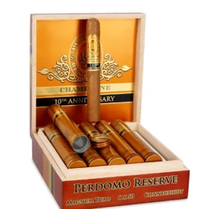 Perdomo Reserve 10th Anniversary Connecticut Magnum 50 Tubo features a butterscotch Ecuadorian wrapper with sweet cream and honey notes, plus rich, spicy, oaky Nicaraguan fillers.