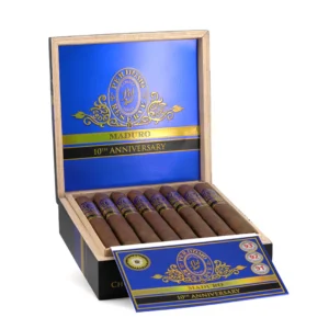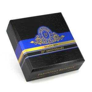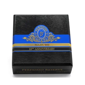 Perdomo Reserve 10th Anniversary Box-Pressed Maduro offers a medium to full-bodied Nicaraguan blend with bourbon barrel-aged wrappers, featuring sweet dark cocoa and espresso notes.